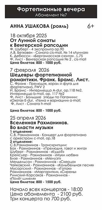 Абонемент №7 «Фортепианные вечера» включает три концерта: «От «Лунной сонаты» к «Венгерской рапсодии», «Шедевры фортепианной романтики. Франк. Брамс. Лист» и «Вселенная Рахманинов. Во власти музыки».